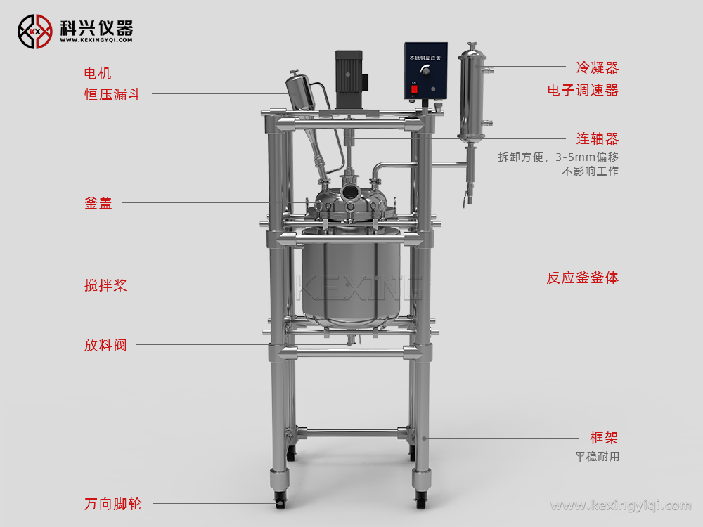 上海科興儀器生產雙層不銹鋼反應釜主要用于制藥、化工、實驗室等機構的有機合成實驗室用中式設備,用于有機物合成實驗中,是生化制藥中的主要設備之一。